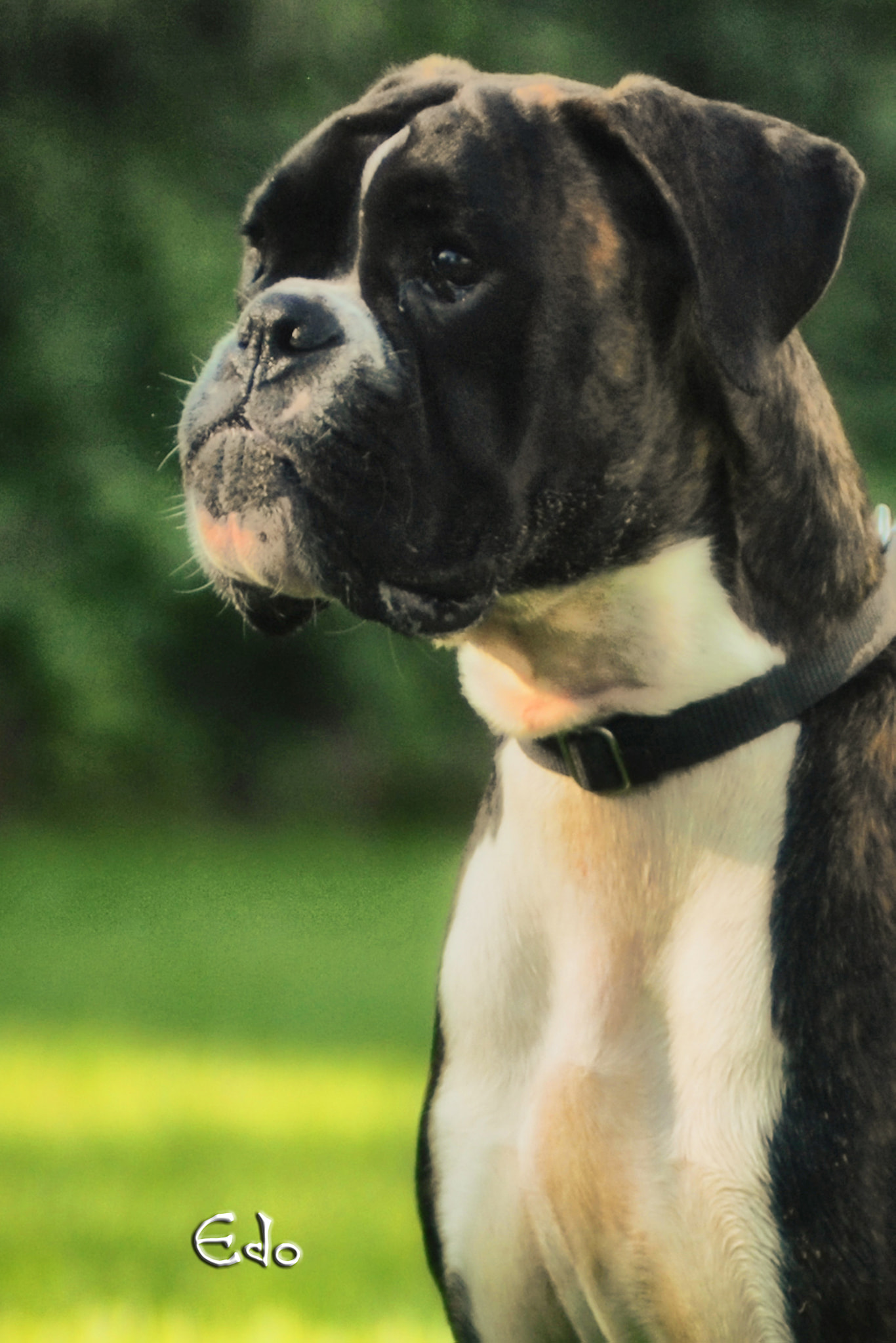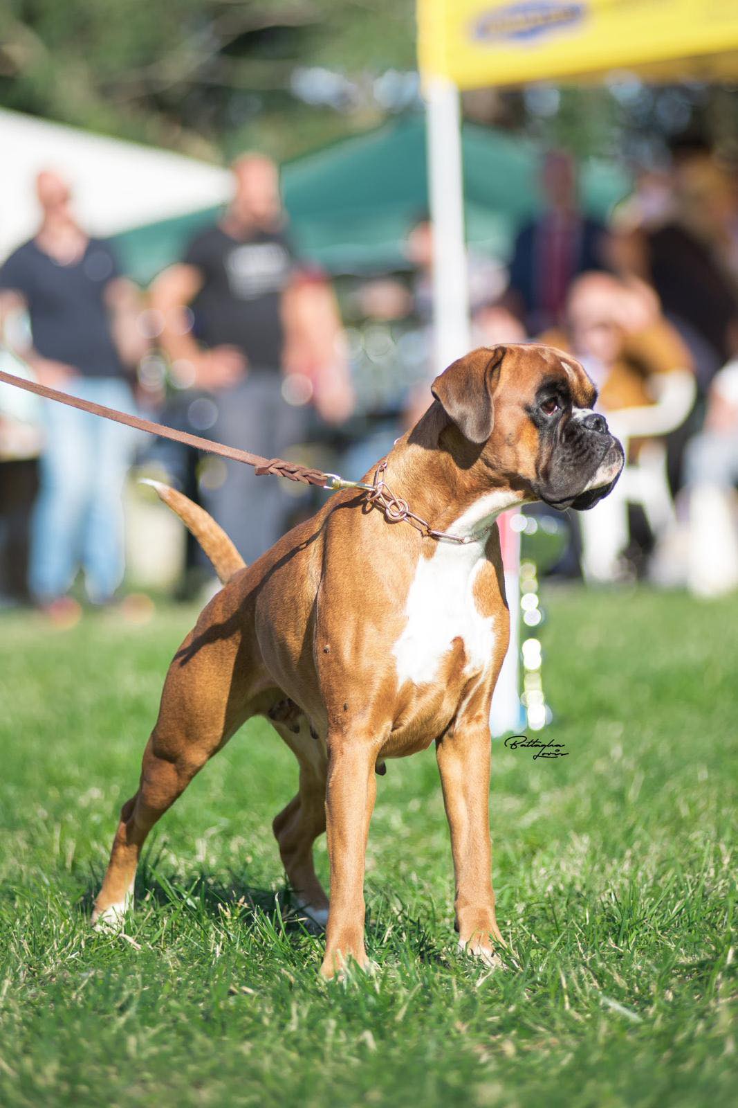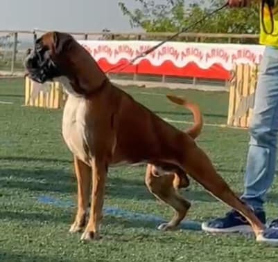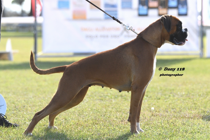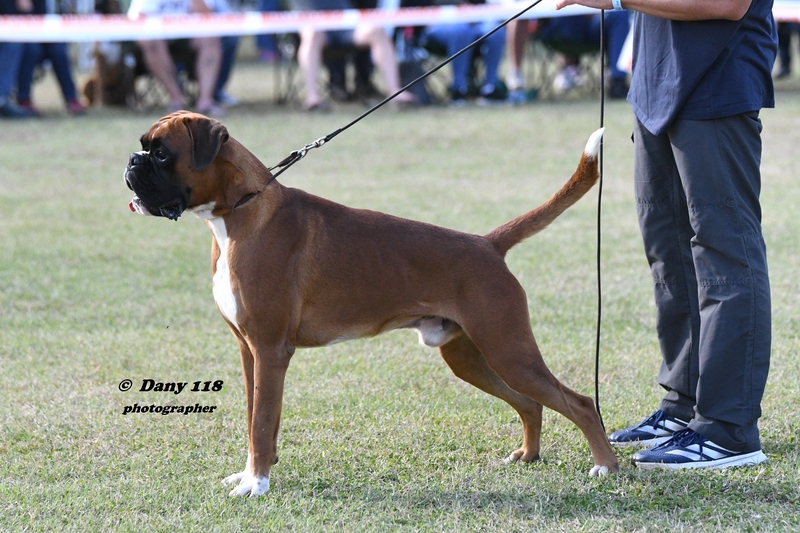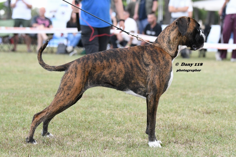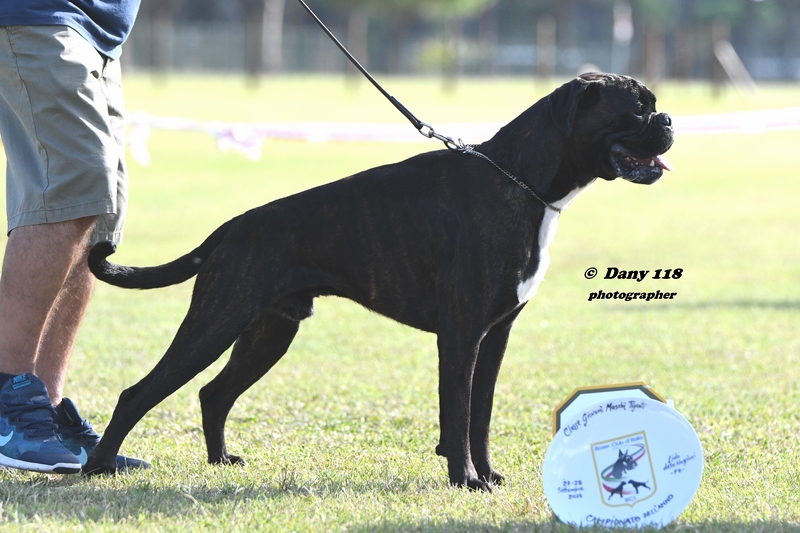 EMILIO BOXER CALDARELLI Nato il 14/01/2020. Tipico, compatto, solido, buona media taglia, torace ben sviluppato nelle tre dimensioni, bel profilo superiore molto solido, posteriore angolato funzionalmente al di là di una tibia un filo lunga, vorrei raggi ossei un filo più lunghi sull'anteriore in rapporto alla profondità del torace ma comunque si esprimono in modo funzionale. Collo mascolino, asciutto, elegante, testa tipica, ben proporzionata, espressiva, con cranio ben contenuto lateralmente, occhi ben aperti, espressivi, muso potente, denti e mento corretti. Temperamento attento. Andatura muove con temperamento allungo un po' limitato sull'azione dell'anteriore. Eccellente. |
